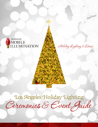 2016 Los Angeles Christmas Lighting Ceremonies and Events Guide Mobile Illumination is pleased to present our annual edition of The 2016 Los Angeles Christmas Lighting Ceremonies and Events Guide. Every year in this guide we compile the most exciting and family-friendly Holiday events that take place in and around Los Angeles. Our clients love this convenient tool and use it to plan their Holiday-inspired family outings during the Season. We at Mobile Illumination, a professional Christmas lighting and Décor company, feel special joy knowing that all properties featured in this guide were made Holiday ready by our expert crews. In just about a month they installed dozens of Holidays wreaths and many miles of garland, hung millions of festive lights and decorated countless trees, rooflines, and entryways. Please review this guide and see for yourself all the destinations, lighting ceremonies, and other festive events that will be taking place to make this Holiday season just a little brighter, a lot more fun, and absolutely magical for everyone to enjoy. Download the 2016 Guide to Los Angeles Holiday Ceremonies & Events Guide